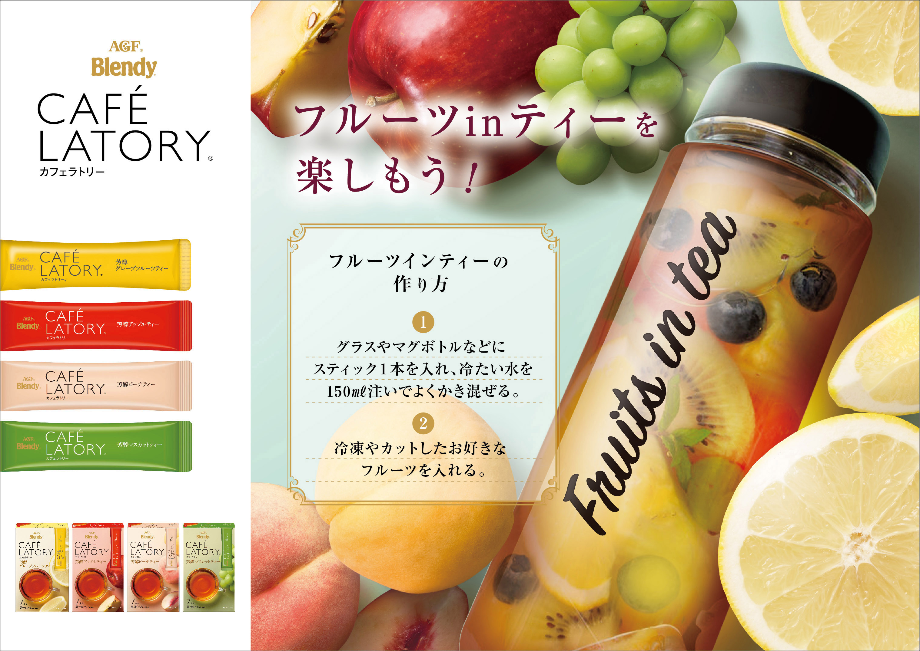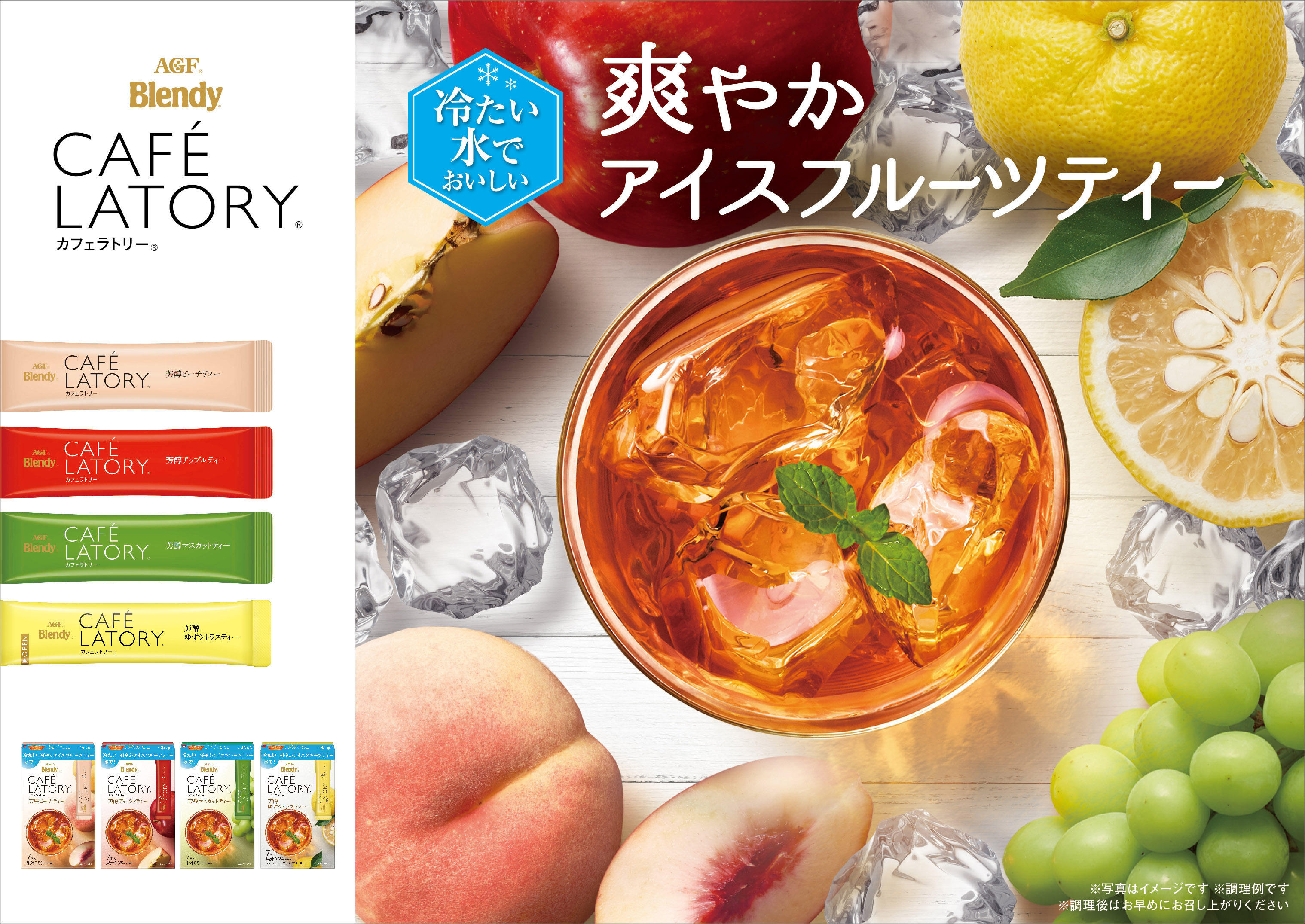 クリアボトル内に浮かぶフルーツや、製品特長を表現するための卓上演出には氷を配しながら爽やかな光と影を描き込み、みずみずしさを表現する等、画像合成を駆使したイメージ作りはツネオデザインの強みでもあります。